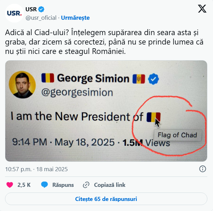 „Adică al Ciad-ului? Înțelegem supărarea din seara asta și graba, dar zicem să corectezi, până nu se prinde lumea că nu știi nici care e steagul României” - au comentat cei din USR.