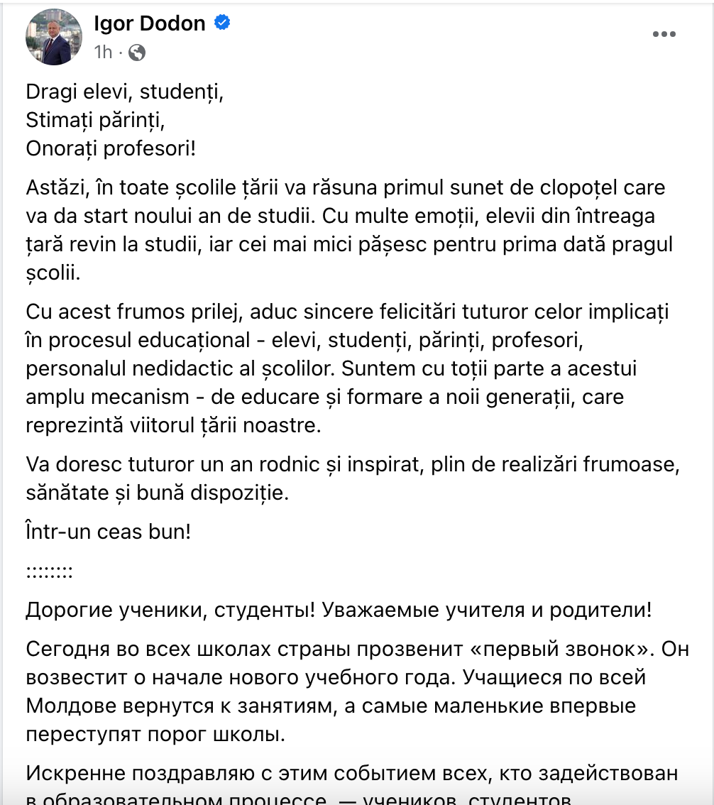 Cu acest frumos prilej, aduc sincere felicitări tuturor celor implicați în procesul educațional - elevi, studenți, părinți, profesori, personalul nedidactic al școlilor. Suntem cu toții parte a acestui amplu mecanism - de educare și formare a noii generații, care reprezintă viitorul țării noastre.