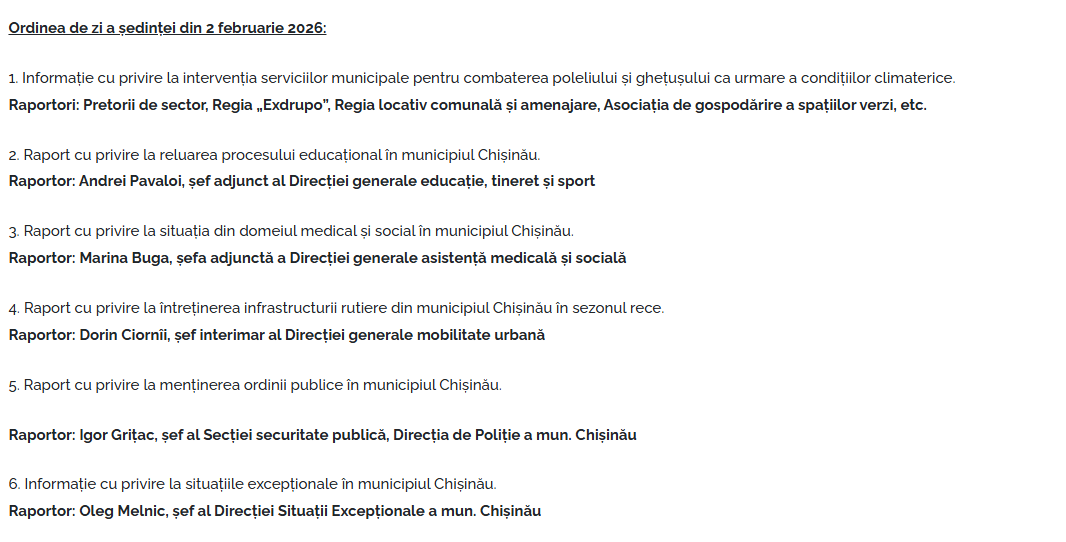 Primarul general al capitalei, Ion Ceban, a convocat astăzi, 2 februarie 2026, ședința operativă a serviciilor Primăriei Chișinău. Pe ordinea de zi au figurat șase subiecte.