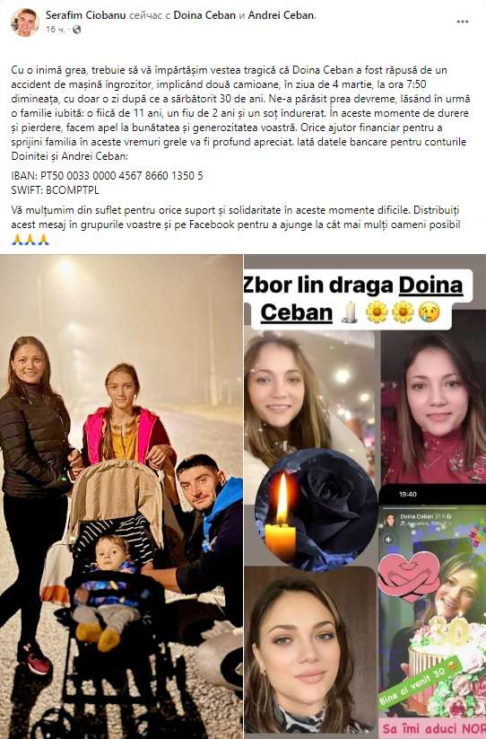 „Cu o inimă grea, trebuie să vă împărtășim vestea tragică că Doina Ceban a fost răpusă de un accident de mașină îngrozitor, implicând două camioane, în ziua de 4 martie, la ora 7:50 dimineața, la doar o zi după ce a sărbătorit 30 de ani. Ne-a părăsit prea devreme, lăsând în urmă o familie iubită: o fiică de 11 ani, un fiu de 2 ani și un soț îndurerat.