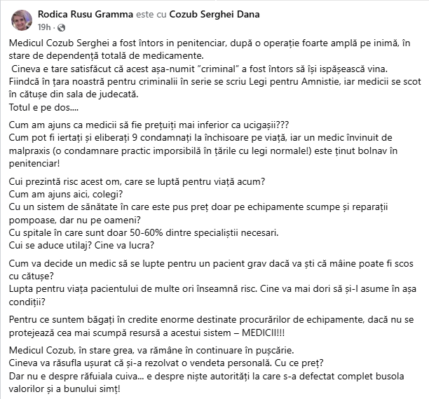 Medicul Cozub, în stare grea, va rămâne în continuare în pușcărie. Cineva va răsufla ușurat că și-a rezolvat o vendeta personală. Cu ce preț? Dar nu e despre răfuiala cuiva, e despre niște autorități la care s-a defectat complet busola valorilor și a bunului simț”, a scris Rodica Rusu.