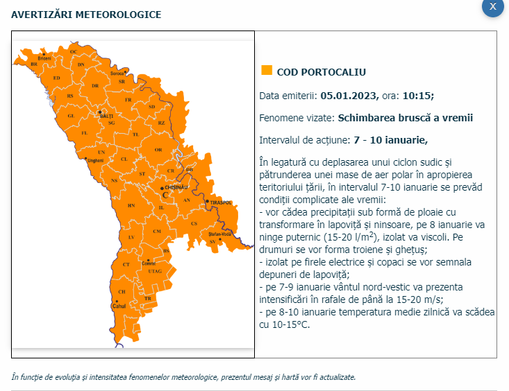 „În legatură cu deplasarea unui ciclon sudic și pătrunderea unei mase de aer polar în apropierea teritoriului țării, în intervalul 7-10 ianuarie se prevăd condiții complicate ale vremii: - vor cădea precipitații sub formă de ploaie cu transformare în lapoviță și ninsoare, pe 8 ianuarie va ninge puternic (15-20 l/m2), izolat va viscoli. Pe drumuri se vor forma troiene și ghețuș; - izolat pe firele electrice și copaci se vor semnala depuneri de lapoviță; - pe 7-9 ianuarie vântul nord-vestiс va prezenta intensificări în rafale de până la 15-20 m/s; - pe 8-10 ianuarie temperatura medie zilnică va scădea cu 10-15°C”, se aratp