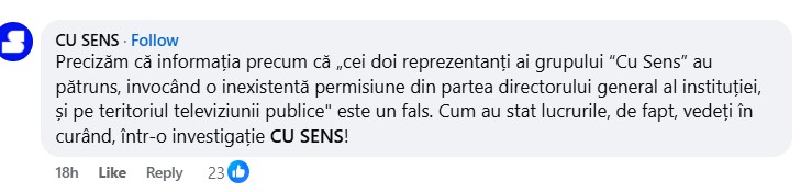 La rândul său, redacția „CU SENS” a venit cu o reacție: „Precizăm că informația precum că „cei doi reprezentanți ai grupului „Cu Sens” au pătruns, invocând o inexistentă permisiune din partea directorului general al instituției, și pe teritoriul televiziunii publice” este un fals. Cum au stat lucrurile, de fapt, vedeți în curând, într-o investigație CU SENS!”.