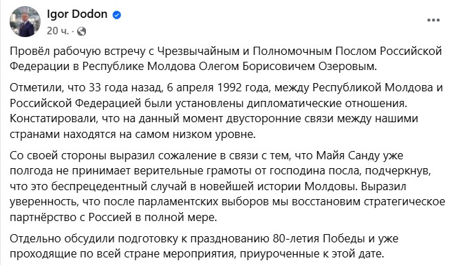 Mi-am exprimat regretul față de faptul că Maia Sandu nu acceptă de jumătate de an scrisorile de acreditare din partea domnului ambasador, subliniind că este un caz fără precedent în istoria recentă a Moldovei. Mi-am exprimat convingerea că, după alegerile parlamentare, vom restabili parteneriatul strategic cu Rusia.