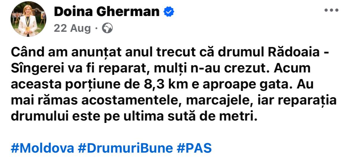 „Când am anunțat anul trecut că drumul Rădoaia - Sîngerei va fi reparat, mulți n-au crezut. Acum aceasta porțiune de 8,3 km e aproape gata. Au mai rămas acostamentele, marcajele, iar reparația drumului este pe ultima sută de metri”, a relatat vicepreședinta Parlamentului, într-un filmuleț.