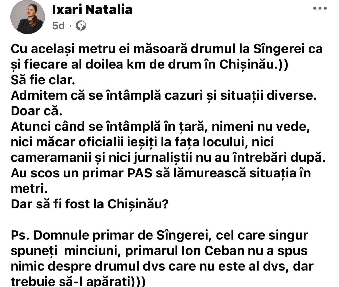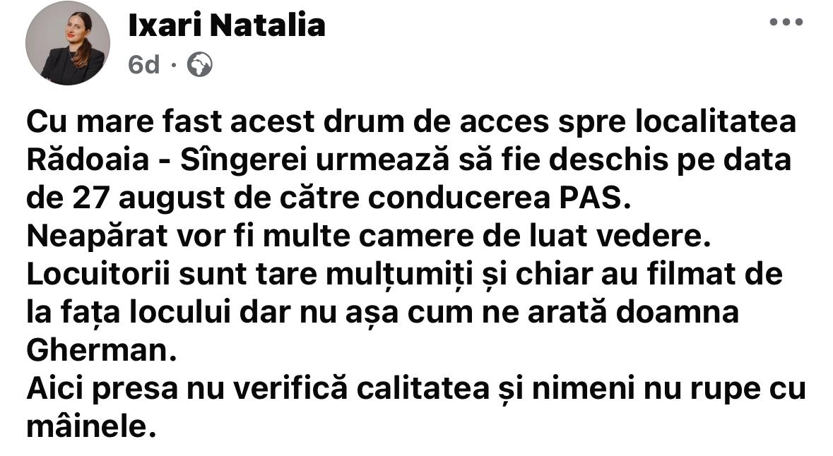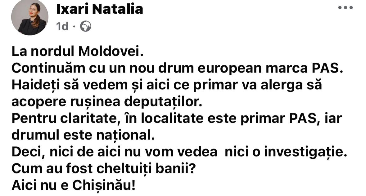 În replică, Ixari a precizat că a fost „scos un primar PAS să lămurească situația în metri” și a publicat mai multe imagini cu drumurile de la nordul țării.