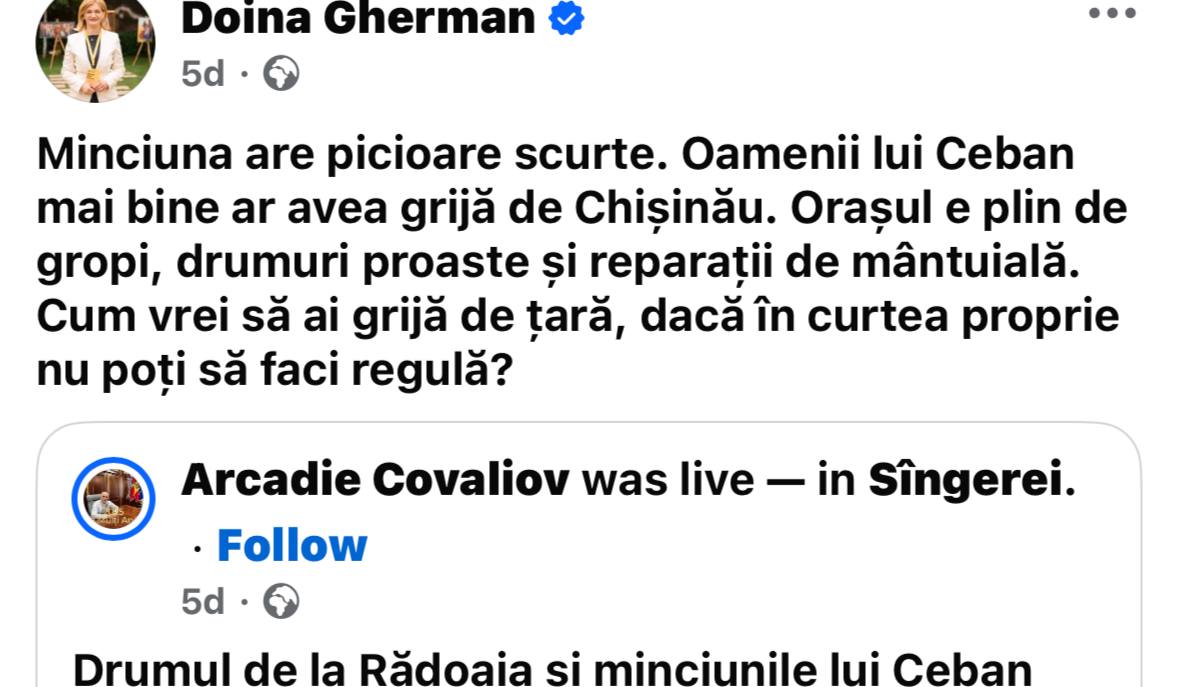 „Domnule Ceban, înțeleg că aveți probleme cu înfrățirile și că toți renunță să aibă de a face cu slugile Moscovei. Dacă tot nimeni nu vă vrea, propun să vă înfrățiți cu Sîngereiul, Centrul Europei, și vă învață domnul primar Arcadie Covaliov cum se fac drumurile bune”, a precizat ASD.
