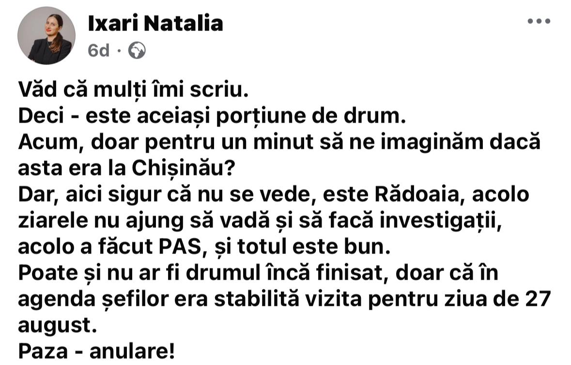 Poate și nu ar fi drumul încă finisat, doar că în agenda șefilor era stabilită vizita pentru ziua de 27 august. Paza - anulare”, a menționat aceasta.