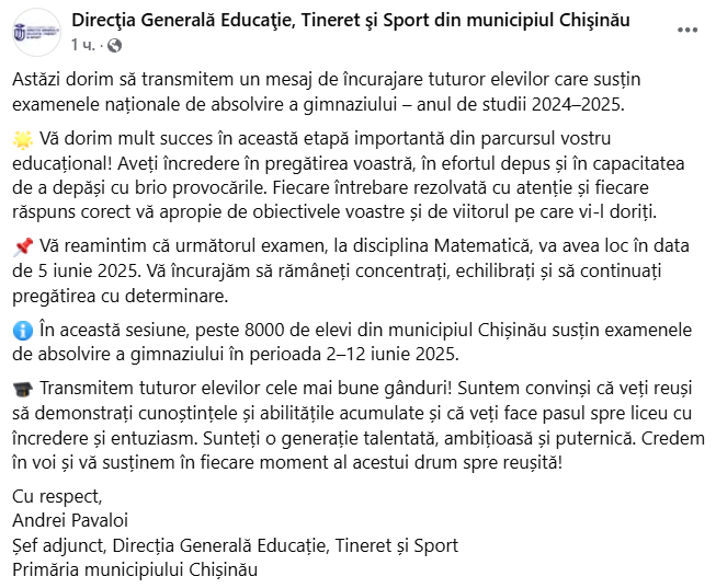 Cu această ocazie, Direcția Generală Educație, Tineret și Sport din cadrul Primăriei Chișinău a transmis un mesaj de încurajare elevilor, îndemnându-i să aibă încredere în munca depusă și să abordeze examenele cu echilibru și determinare.
