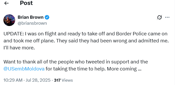 Vreau să le mulțumesc tuturor celor care au trimis tweet-uri în semn de susținere și @USembMoldova pentru că și-au făcut timp să mă ajute. Urmează mai multe...”, a scris pe X activistul conservator și preşedintele Organizaţiei Internaţionale pentru Familie, Brian Brown.
