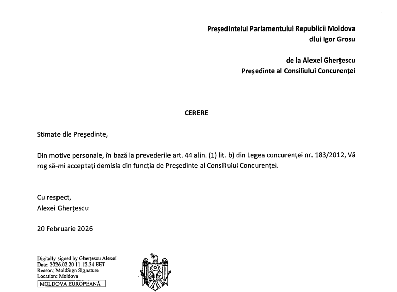 Alexei Gherțescu a depus cerere de demisie la 20 februarie 2026, invocând motive personale. Hotărârea adoptată intră în vigoare la 1 martie 2026.