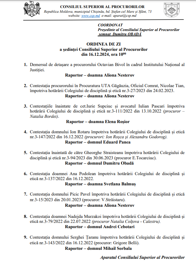 update CSP a hotărât să exprime detașarea pentru 18 luni a procurorului Octavian Bivol în cadrul Institutului Național al Justiției, în funcția de șef al secției Instruite continuă, a declarat Obadă.