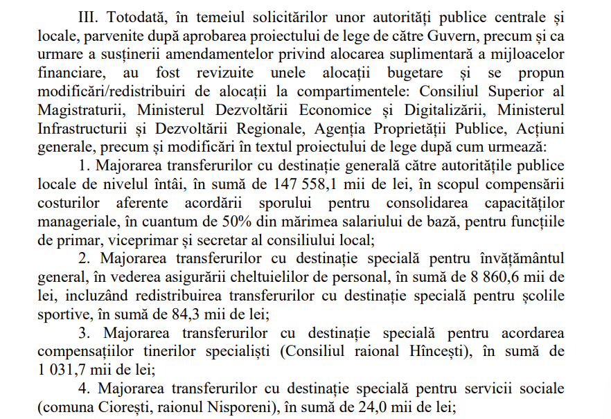 - Majorarea transferurilor cu destinație generală către autoritățile publice locale de nivelul întâi, în sumă de 147 558,1 mii de lei, în scopul compensării costurilor aferente acordării sporului pentru consolidarea capacităților manageriale, în cuantum de 50% din mărimea salariului de bază, pentru funcțiile de primar, viceprimar și secretar al consiliului local;