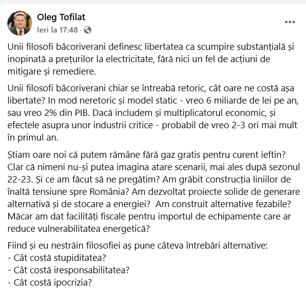 „Unii filosofi bâcoriverani definesc libertatea ca scumpire substanțială și inopinată a prețurilor la electricitate, fără nici un fel de acțiuni de mitigare și remediere.