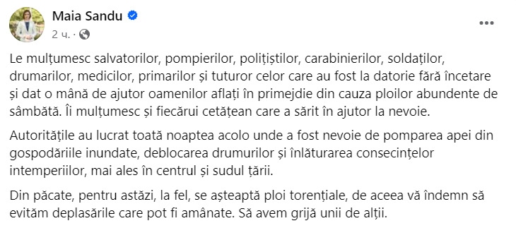 Din păcate, pentru astăzi, la fel, se așteaptă ploi torențiale, de aceea vă îndemn să evităm deplasările care pot fi amânate. Să avem grijă unii de alții”, a scris șefa statului pe pagina sa de Facebook.