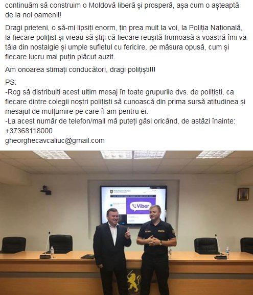 „Și dacă voi, sau subalternii voștri nu vă veți regăsi în poliție din diferite motive, să știți că sunteți așteptați și bineveniți în echipa mea, ca să continuăm să construim o Moldovă liberă și prosperă, așa cum o așteaptă de la noi oamenii”, zice Cavcaliuc, care a anunțat anterior că își va lansa un partid politic.