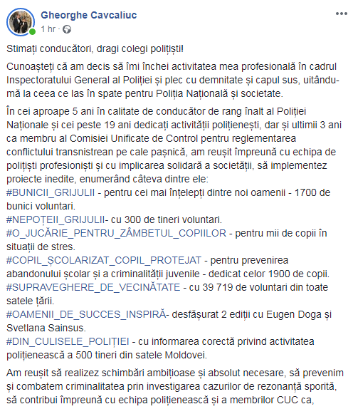 „Plec din poliție, dar voi fi în continuare alături de voi și cetățenii Republicii Moldova! Vă promit să îmi depun toate capacitățile și experiența pentru a construi o formațiune politică pentru oameni și țara noastră”, a mai scris fostul adjunct IGP.