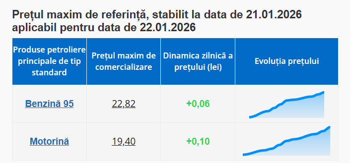 Agenția Națională pentru Reglementare în Energetică (ANRE) a afișat noile prețuri la carburanți pentru mâine, 21 ianuarie. Astfel, motorina va fi mai scumpă cu 10 bani, iar prețul benzinei crește cu 6 bănuți.