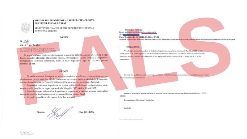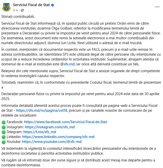 Serviciul Fiscal de Stat informează că, în spațiul public circulă un pretins Ordin emis de către directoarea instituției, doamna Olga Golban, referitor la modificarea termenului limită de prezentare a Declarației cu privire la impozitul pe venit pentru anul 2024 de către persoanele fizice. De asemenea, acest document este remis la adresele electronice a mai multor contribuabili din numele directorului adjunct, domnul Iuri Lichii, fiind utilizată o adresă de e-mail trucată.