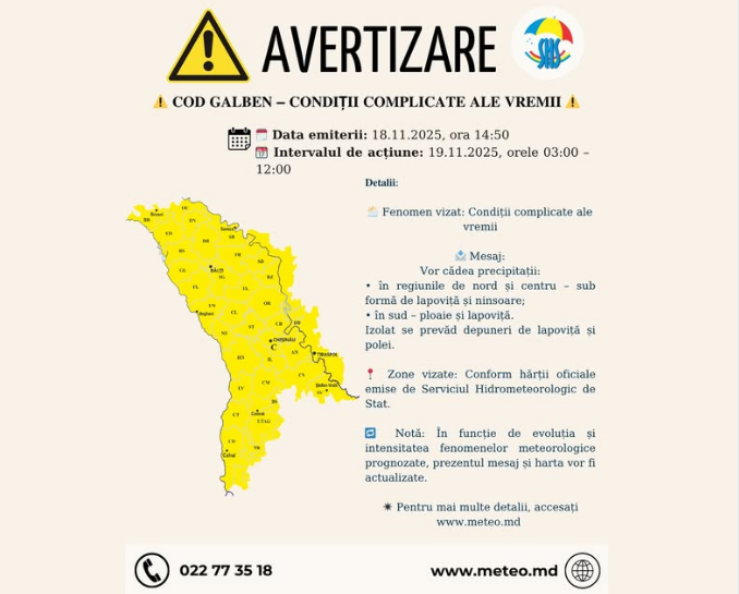 Serviciul Hidrometeorologic de Stat a emis cod galben de schimbarea bruscă a vremii pentru ziua de 19 noiembrie. Astfel în intervalul orelor 03:00 - 12:00 se prevăd precipitații sub formă de ploaie, lapoviță și ninsoare.