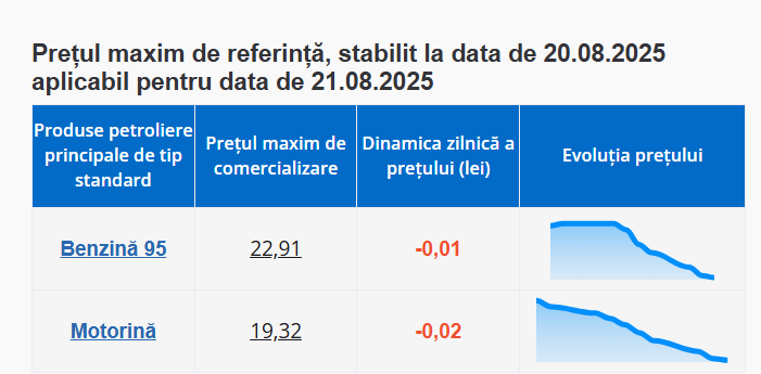 Prin urmare, mâine, 21 august, un litru de benzină va costa 22,91 lei, iar cel de motorină - 19.32 lei.