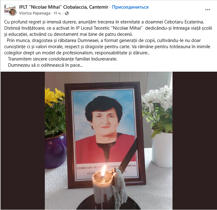 „Cu profund regret și imensă durere, anunțăm trecerea în eternitate a doamnei Cebotaru Ecaterina.