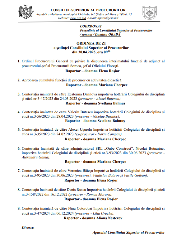 update CSP examinează, cu ușile închise, contestația înaintată de către Ecaterina Danilova împotriva hotărârii Colegiului de disciplină și etică nr.3-47/2023 din 24.03.2023 (procuror - Alexei Buțenco).