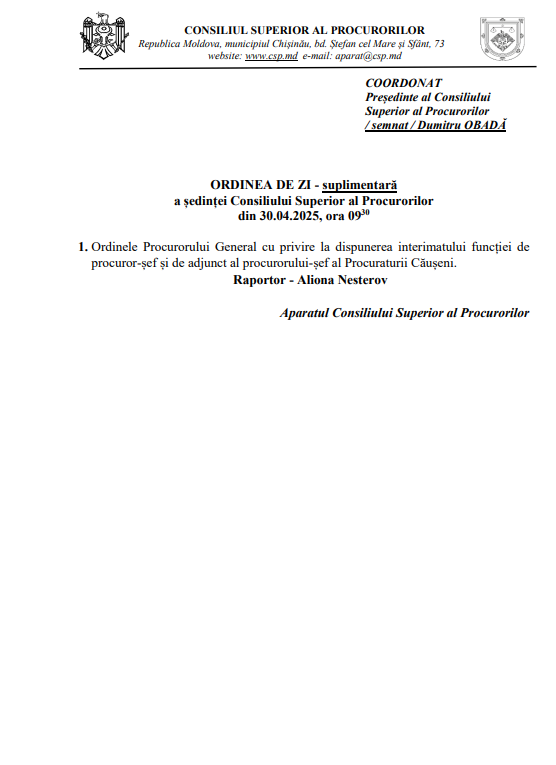 update CSP a respins ordinul Procurorului General cu privire la dispunerea interimatului funcției de adjunct al procurorului-șef al Procuraturii Soroca, șef al Oficiului Florești. Astfel, împotriva candidaturii lui Serghei Cebotari au votat 9 membrie CSP.