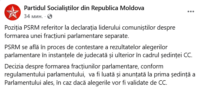 Decizia despre formarea fracțiunilor parlamentare, conform regulamentului parlamentului, va fi luată și anunțată la prima ședință a Parlamentului ales, în caz dacă alegerile vor fi validate de CC”, se arată în mesajul socialiștilor.