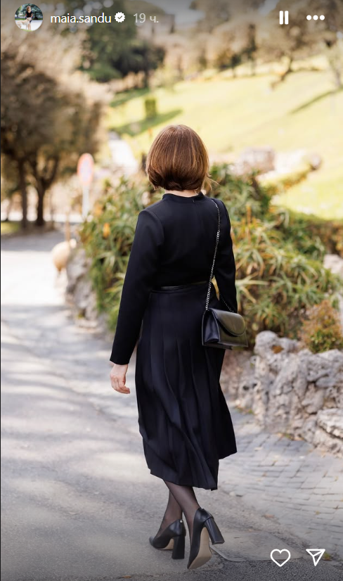 Maia Sandu a mai adăugat o pereche de ochelari, precum și pantofi cu vârf închis, conform reglementărilor vestimentare și și-a păstrat accesoriile la minimum. Ținuta a fost completată cu o geantă, la fel, de culoare neagră.