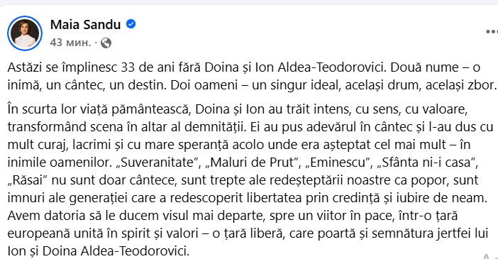 În scurta lor viață pământească, Doina și Ion au trăit intens, cu sens, cu valoare, transformând scena în altar al demnității. Ei au pus adevărul în cântec și l-au dus cu mult curaj, lacrimi și cu mare speranță acolo unde era așteptat cel mai mult – în inimile oamenilor. „Suveranitate”, „Maluri de Prut”, „Eminescu”, „Sfânta ni-i casa”, „Răsai” nu sunt doar cântece, sunt trepte ale redeșteptării noastre ca popor, sunt imnuri ale generației care a redescoperit libertatea prin credință și iubire de neam. Avem datoria să le ducem visul mai departe, spre un viitor în pace, într-o țară europeană unită în spirit și valori – o țară liberă, care poartă și semnătura jertfei lui Ion și Doina Aldea-Teodorovici”, a scris Maia Sandu.
