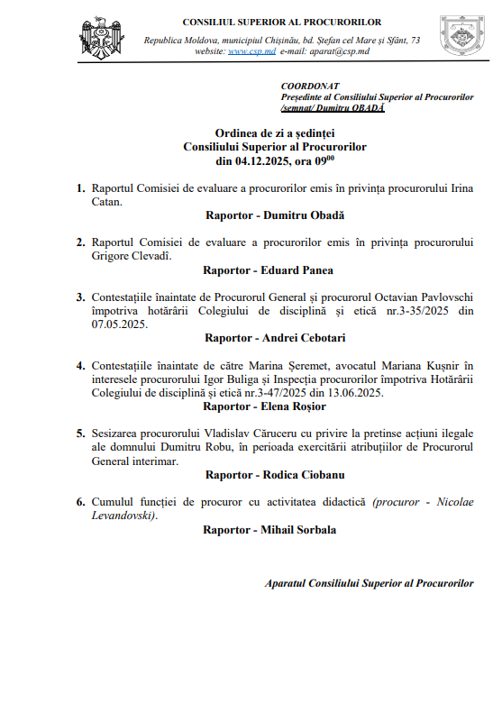 Plenul Consiliului Superior al Procurorilor (CSP) se întrunește astăzi în ședință. Pe ordinea de zi figurează 6 subiecte.