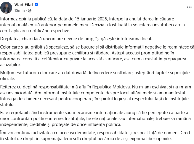 Vlad Filat a venit cu o reacție publică pe rețelele de socializare. Acesta susține că nu se eschivează de la procedurile legale și că hotărârea instanței din Franța, invocată în spațiul public, nu este definitivă.