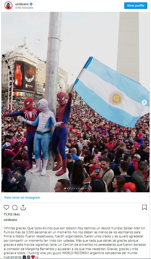 Influencerul argentinian Uki Deane a organizat întâlnirea pe Instagram, cu scopul de a concura și depăși un eveniment din iunie desfășurat în Malaezia, unde 685 de persoane s-au îmbrăcat în Spider-Man.