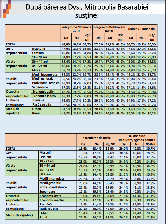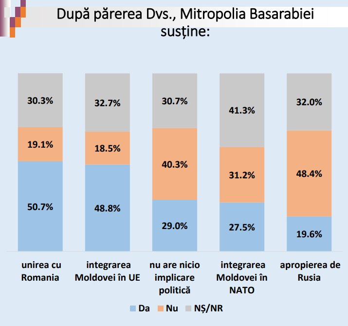 Unirea cu România: Da- 50,7%; Nu- 19,1%; Nu știu/Nu răspund- 30,3%;