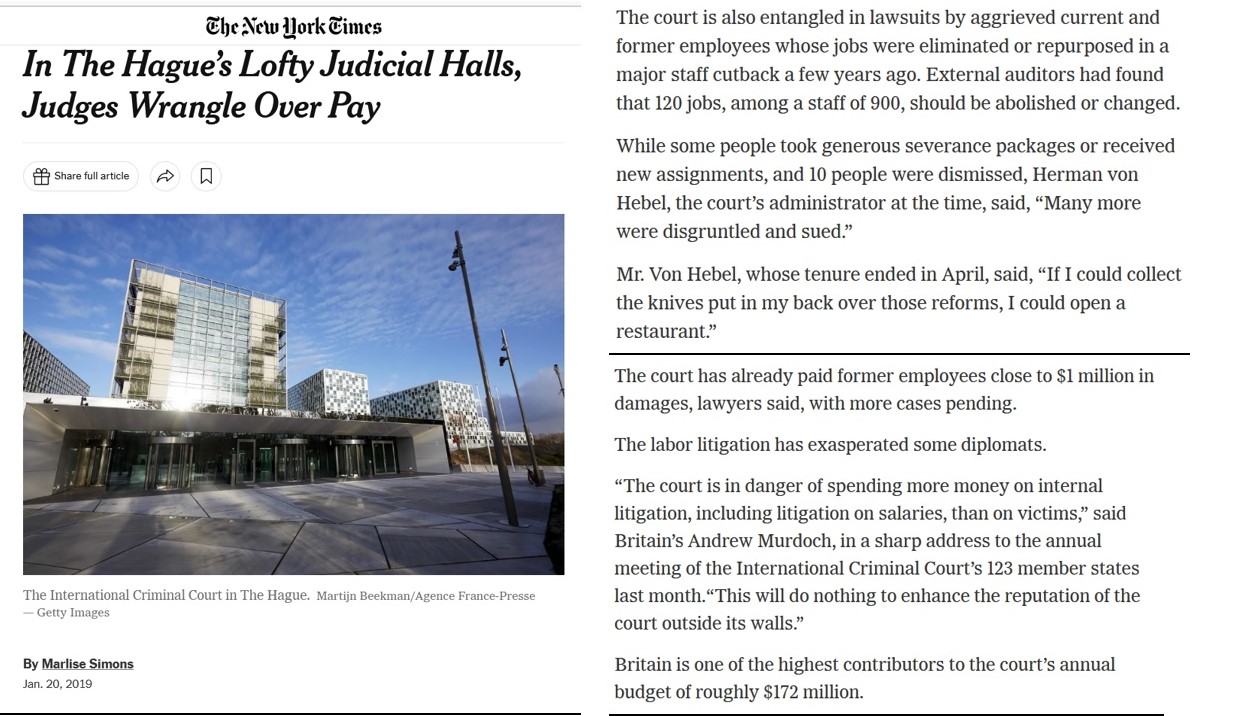 Presa olandeză scria, la 26 februarie 2018, despre 6 hotărâri ale Tribunalului Administrativ de pe lângă Organizația Internațională a Muncii, transmise oficial la sfârșitul lunii ianuarie 2018. Din cauza deciziilor, calificate drept ilegale, ale grefierului von Hebel, Curtea Internațională Penală a fost obligată de Tribunalul Administrativ să achite despăgubiri în valoare totală de 660,000 euro și să suporte în plus cel puțin 100,000 euro drept cheltuieli administrative de reprezentare în procesele pe care le-a pierdut.