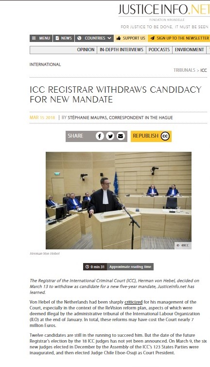 Pe 13 martie 2018 Herman von Hebel s-a retras din concursul pentru obținerea unui nou mandat de cinci ani de grefier al Curții Internaționale Penale de la Haga. Decizia a fost determinată de ilegalități admise în cadrul unei reforme, scrie presa din Olanda. „Von Hebel din Țările de Jos fusese aspru criticat pentru gestionarea Curții, mai ales în contextul planului de reformă ReVision, aspecte ale căruia au fost considerate ilegale de tribunalul administrativ al Organizației Internaționale a Muncii (OIM)...”, scria publicația juridică www.justiceinfo.net, întrun articol publicat la 15 martie 2018.
