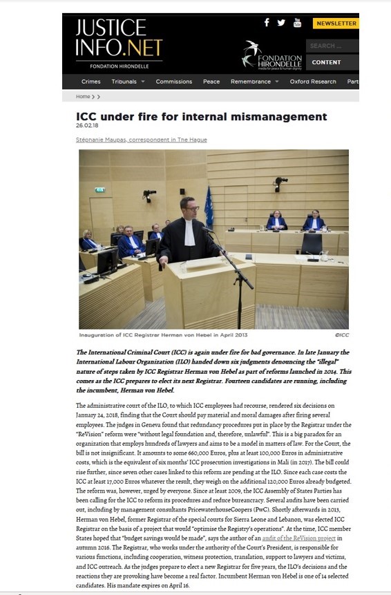 Corespondenta de la Haga pentru portalul JusticeInfo, Stephanie Maupas, și-a întitulat articolul despre activitatea lui Herman von Hebel „Curtea Internațională Penală ia foc pentru proastă administrare” (ICC under fire for internal mismanagement).