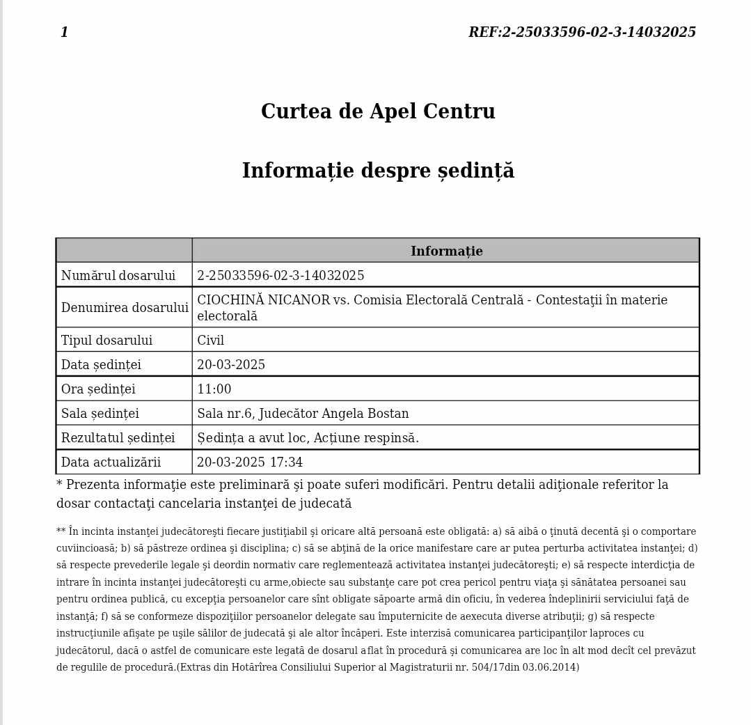 Pe 20 martie 2025 a avut loc ședința de judecată în cadrul căreia cererea depusă de avocații lui Nicanor Ciochină a fost respinsă.