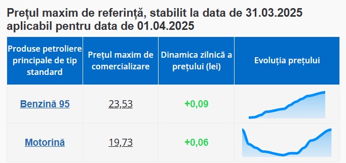 Astfel, un litru de benzină va costa 23,53 lei, iar cel de motorină - 19,73 lei.