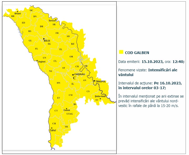 Potrivit meteorologilor, în ziua de 16 octombrie, între orele 03:00 și 17:00, vântul nord-vestic va fi mai jucăuș decât de obicei. „Se anunță rafale de până la 15-20 m/s, așa că asigurați-vă că pălăriile și umbrelele sunt bine ancorate!”, menționează reprezentanții SHS.