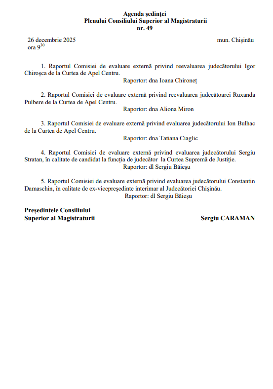 Consiliul Superior al Magistraturii (CSM) s-a întrunit, astăzi, 26 decembrie, într-o nouă ședință. Pe ordinea de zi au figurat 5 subiecte - toate fiind rapoarte ale Comisiei Vetting pe evaluarea judecătorilor Ruxanda Pulbere, Constantin Damaschin, Ion Bulhac, Igor Chiroșca, Sergiu Stratan.