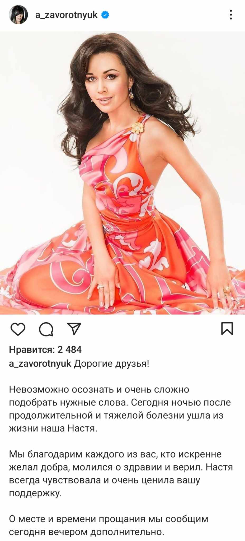 „Este imposibil de realizat și este foarte dificil să găsești cuvintele potrivite. Nastea noastră a murit aseară după o boală gravă.