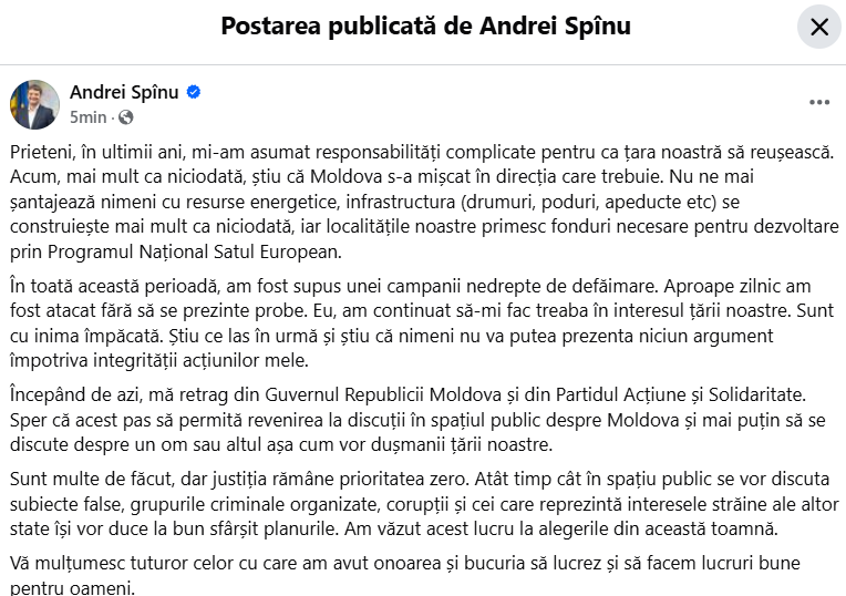 Începând de azi, mă retrag din Guvernul Republicii Moldova și din Partidul Acțiune și Solidaritate. Sper că acest pas să permită revenirea la discuții în spațiul public despre Moldova și mai puțin să se discute despre un om sau altul așa cum vor dușmanii țării noastre.