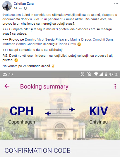 „Luând în considerare ultimele evoluții politice de acasă, diaspora e discriminată doar cu 3 locuri în parlament + multe altele. Din cauza asta, vă provoc la un challenge să mergeți să votați acasă”, a scris pe pagina sa de Facebook, Cristian Zara, un tânăr stabilit în Danamarca.