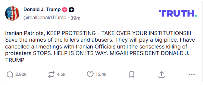 „Patrioți iranieni, continuați protestele - preluați controlul instituțiilor! Rețineți numele ucigașilor și agresorilor. Vor plăti un preț mare. Am anulat toate întâlnirile cu oficialii iranieni până când uciderea fără sens a protestatarilor se va opri. Ajutorul e pe drum”, a scris Trump.