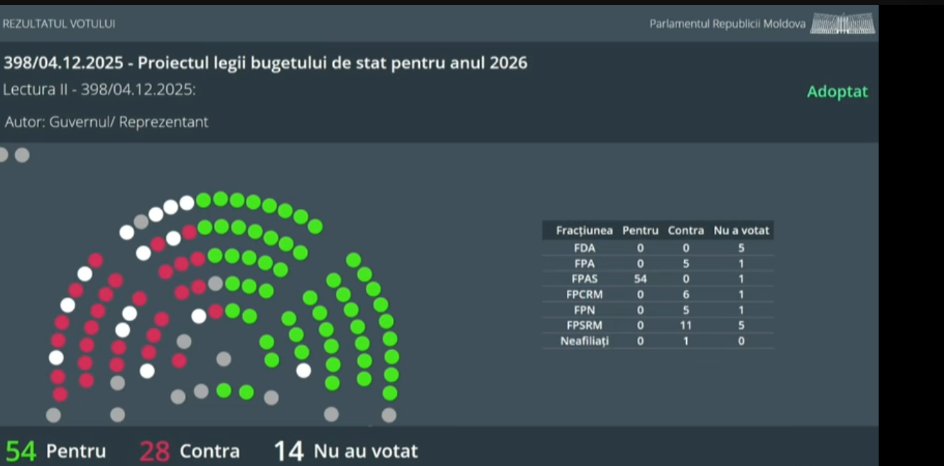 Parlamentul a aprobat, cu 54 de voturi ale deputaților PAS, Proiectul legii bugetului de stat pentru anul 2026.