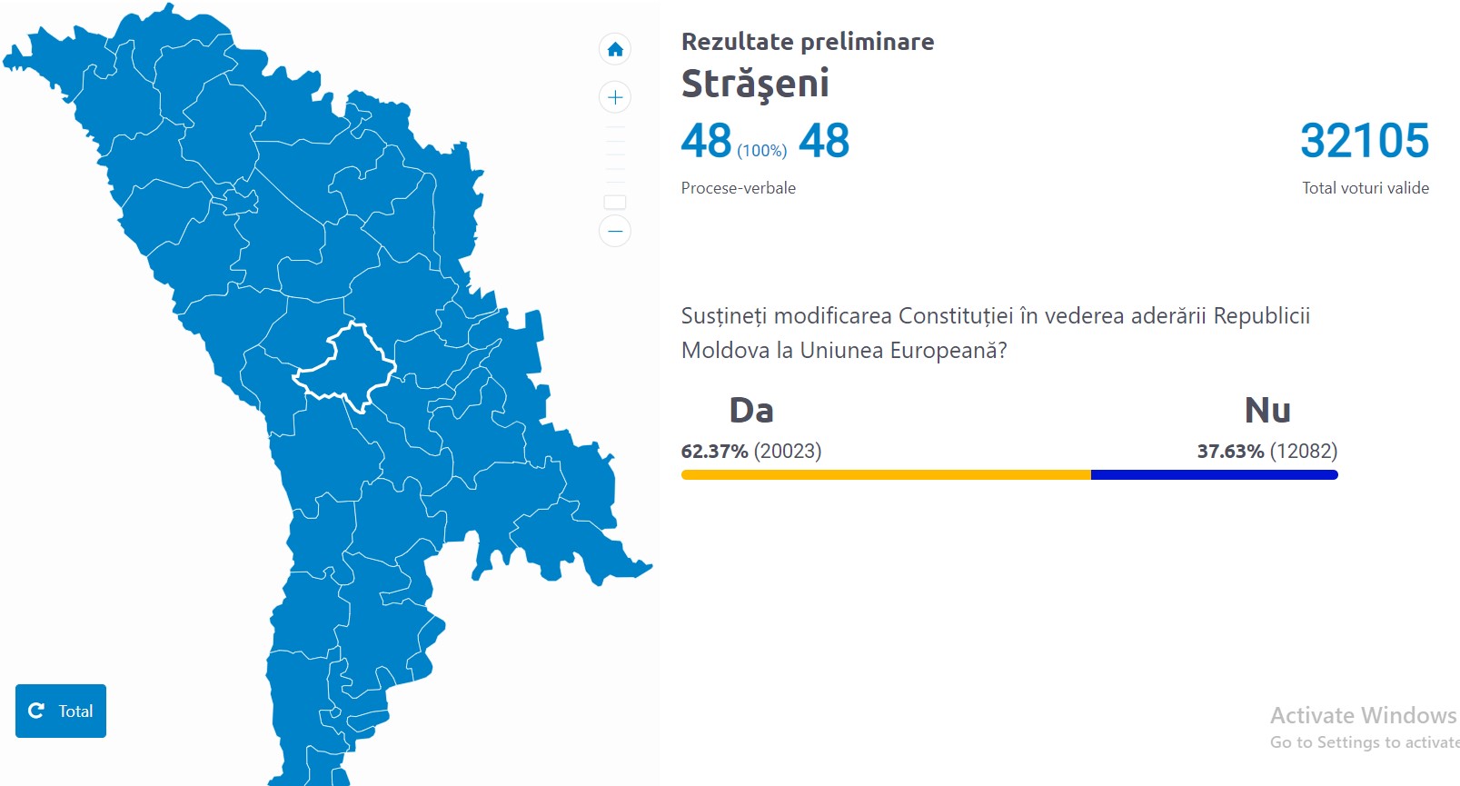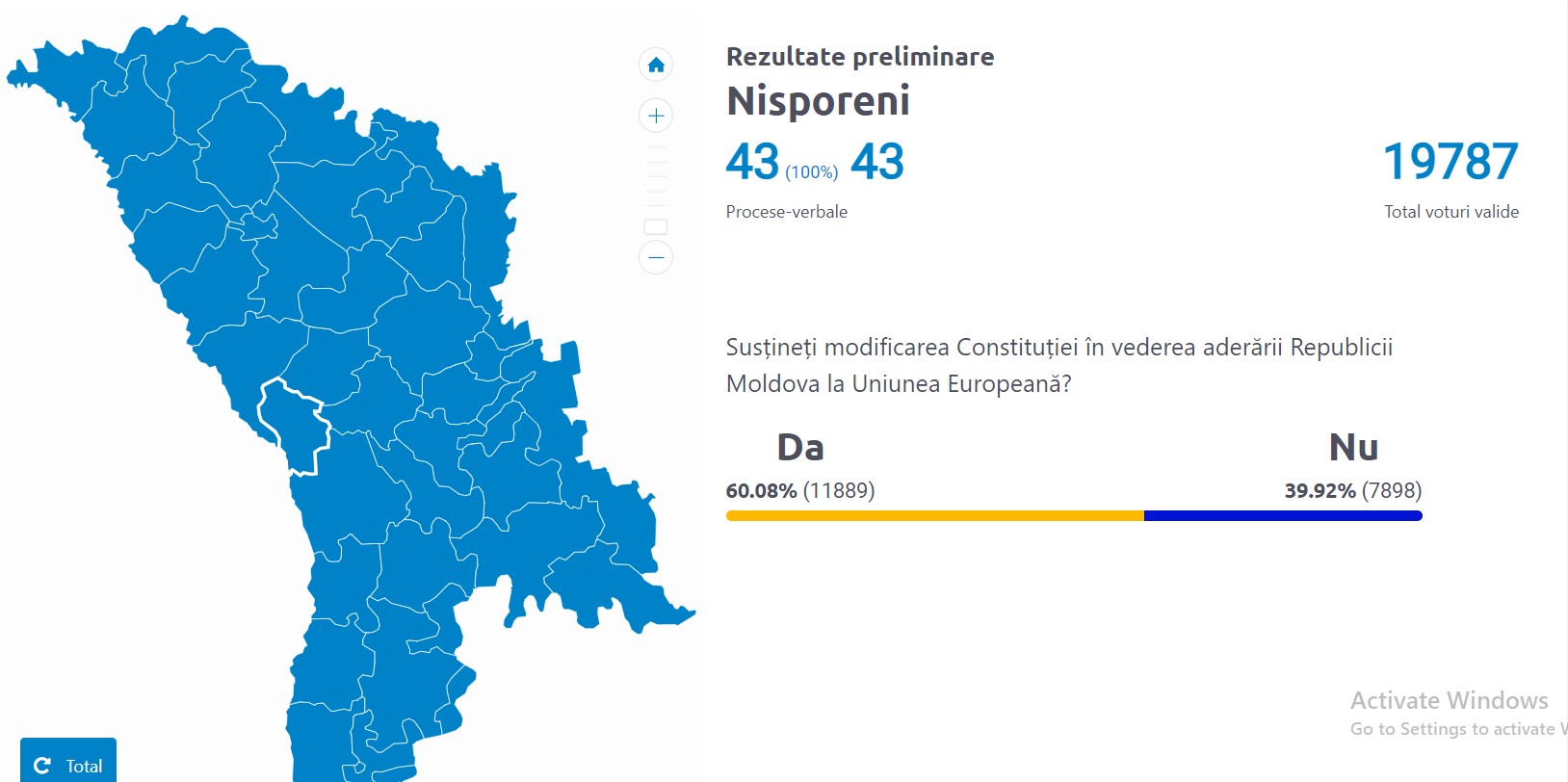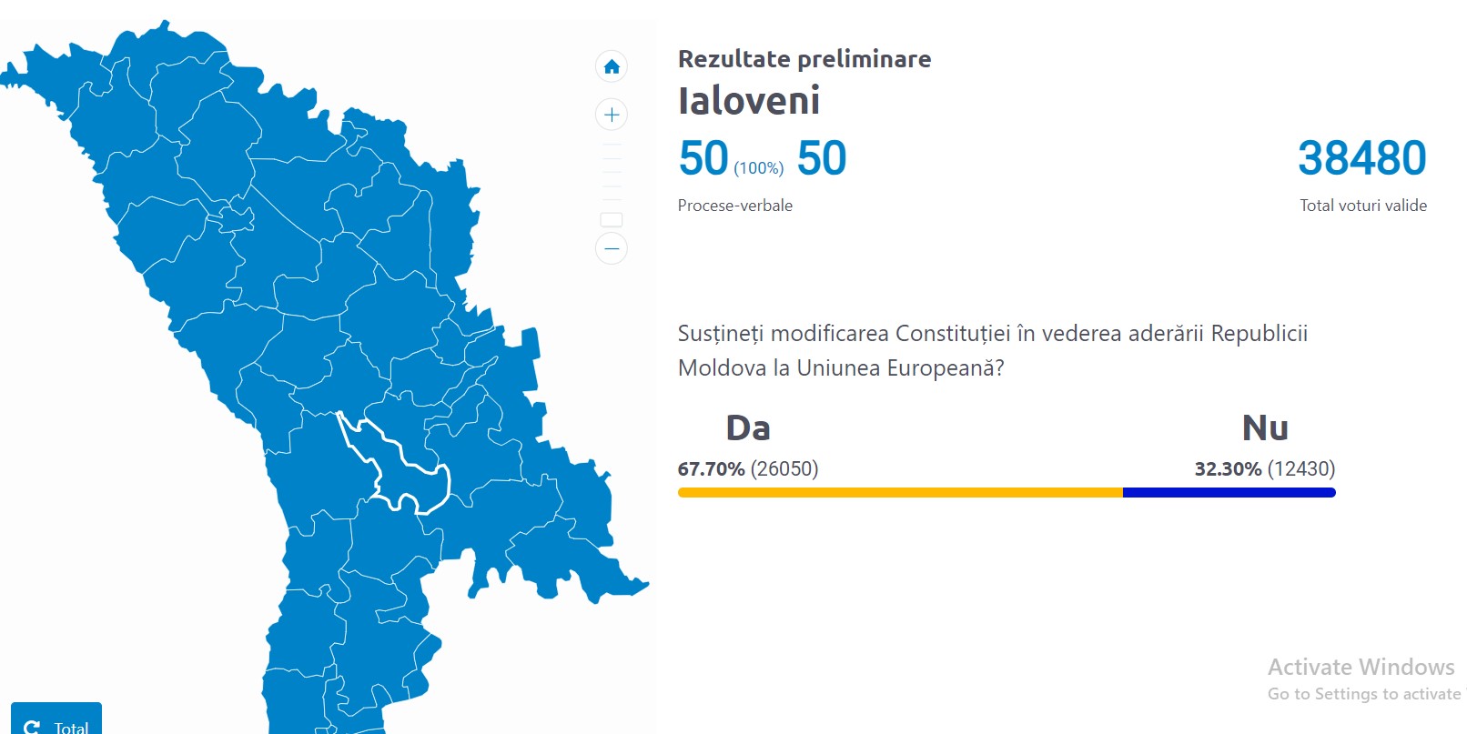 Doar în șapte raioane din țară și în municipiul Chișinău opțiunea „Da” la referendum a trecut pragul de 50%. Cel mai mare număr de alegători care au susținut modificarea Constituției în vederea aderării Republicii Moldova la Uniunea Europeană sunt din Ialoveni, atingând pragul de 67,7%.