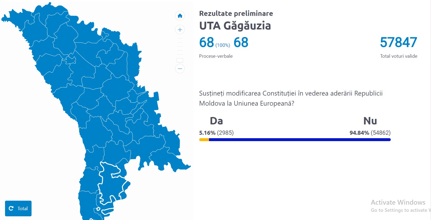 Cea mai mică rată de susținere a referendumului a fost în Găgăuzia - 5,16% din numărul total de alegători.