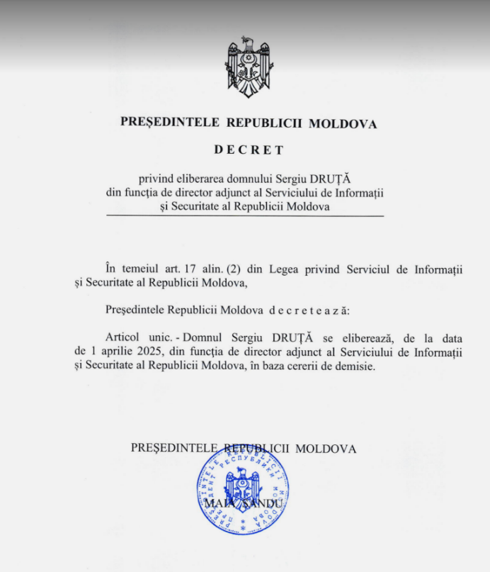 Potrivit decretului semnat de Maia Sandu, Sergiu Druță nu mai este director adjunct al Serviciului de Informații și Securitate din data de 1 aprilie.